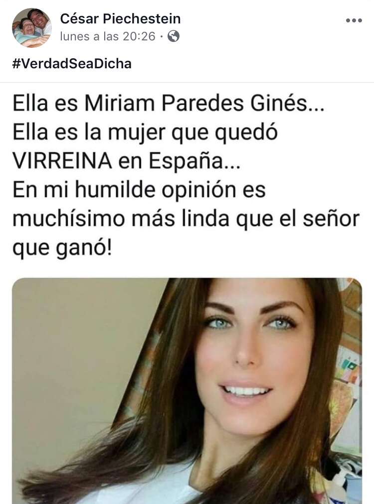 «Ella es Mirian Paredes, ella es la mujer que quedó virreina de España… En mi humilde opinión es más linda que el hombre que gano», posteo el cura con el hastag #LaVerdadSeaDicha.
