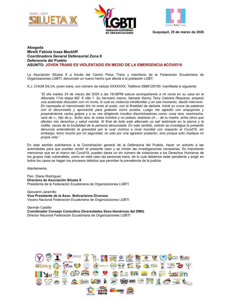La Asociación Silueta X a través del Centro Psico Trans y miembros de la Federación Ecuatoriana de Organizaciones LGBTI, denuncian un nuevo hecho que afecta a la población LGBT.