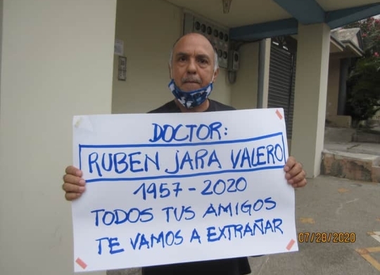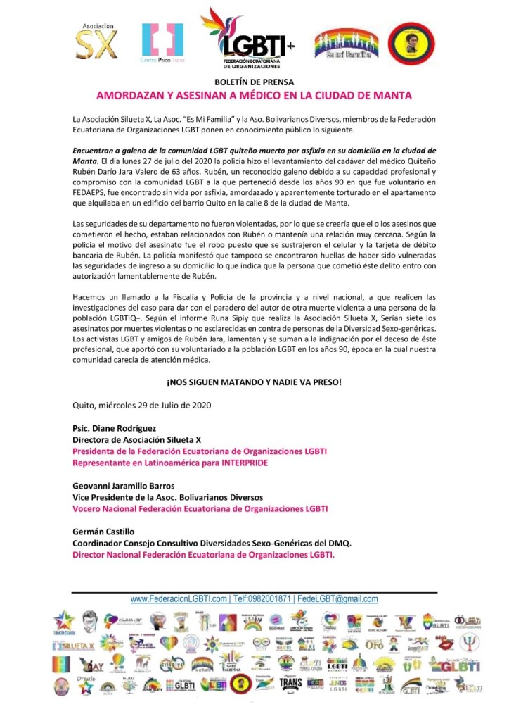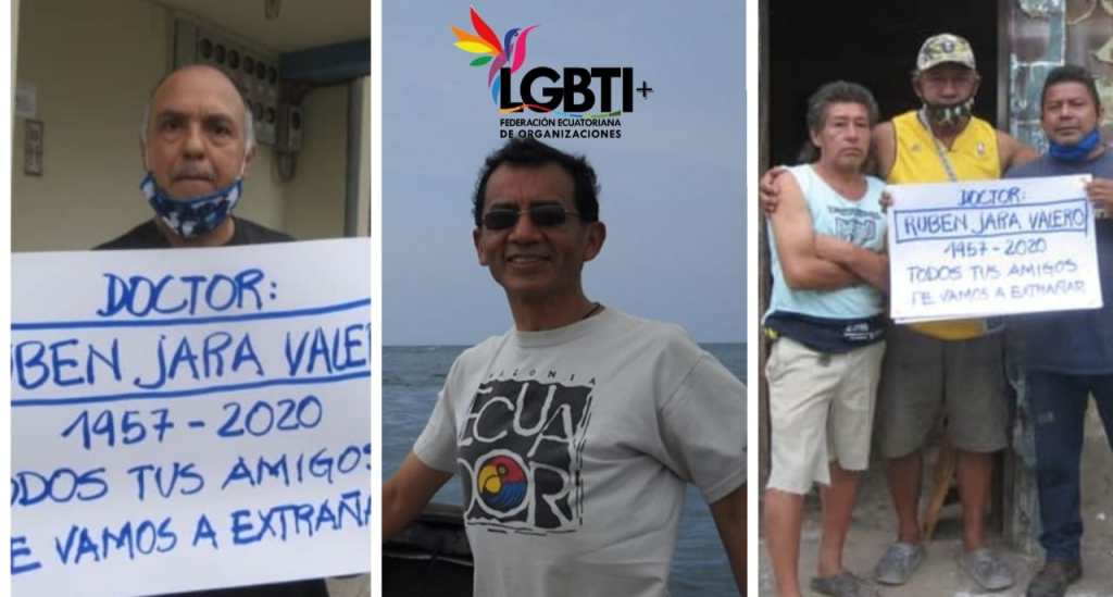 Encuentran a galeno de la comunidad LGBT quiteño muerto por asfixia en su domicilio en la ciudad de Manta. El día lunes 27 de julio del 2020 la policía hizo el levantamiento del cadáver del médico Quiteño Rubén Darío Jara Valero de 63 años. Rubén, un reconocido galeno debido a su capacidad profesional y compromiso con la comunidad LGBT a la que perteneció desde los años 90 en que fue voluntario en FEDAEPS, fue encontrado sin vida por asfixia, amordazado y aparentemente torturado en el apartamento que alquilaba en un edificio del barrio Quito en la calle 8 de la ciudad de Manta.
