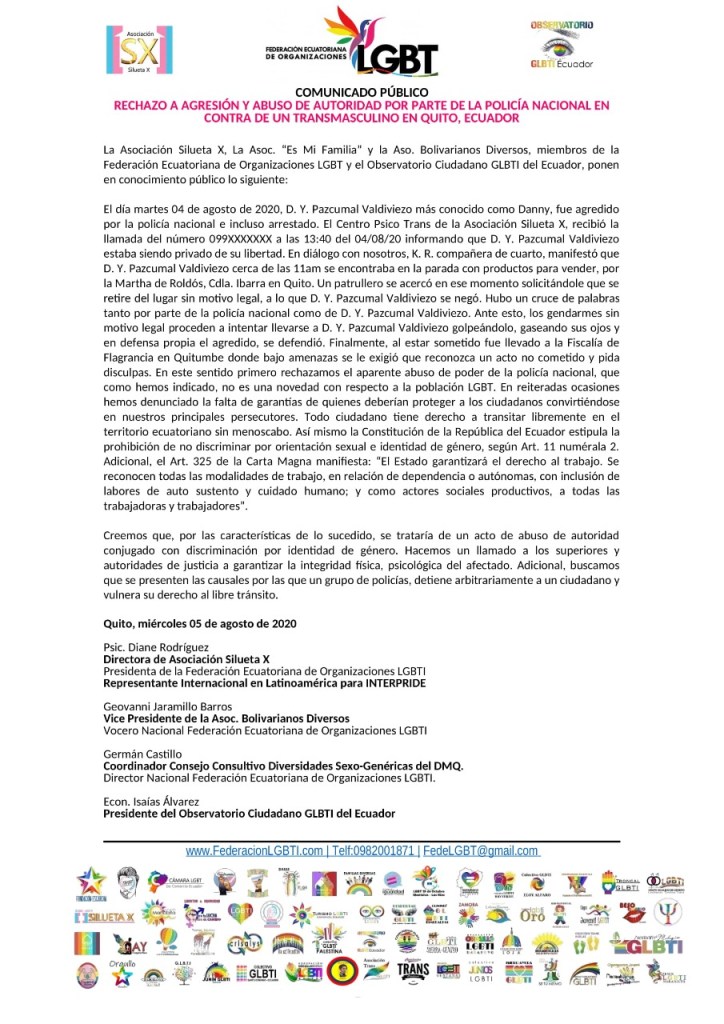 Ecuatoriana de Organizaciones LGBT y el Observatorio Ciudadano GLBTI del Ecuador, ponen en