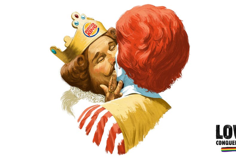 Ronald es el payaso que representa a la marca Mac Donald´s. Burger King es, por otra parte, el rey que representa a la marca del mismo nombre. Estos dos hombres han decidido unirse en un apasionado beso gay en las vallas publicitarias de Finlandia, que por esos días celebra su semana del Orgullo LGTB.