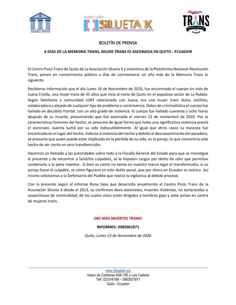 El Centro Psico Trans de Quito de La Asociación Silueta X y miembros de la Plataforma Nacional Revolución Trans, ponen en conocimiento público a días de conmemorar un año más de la Memoria Trans lo siguiente.
