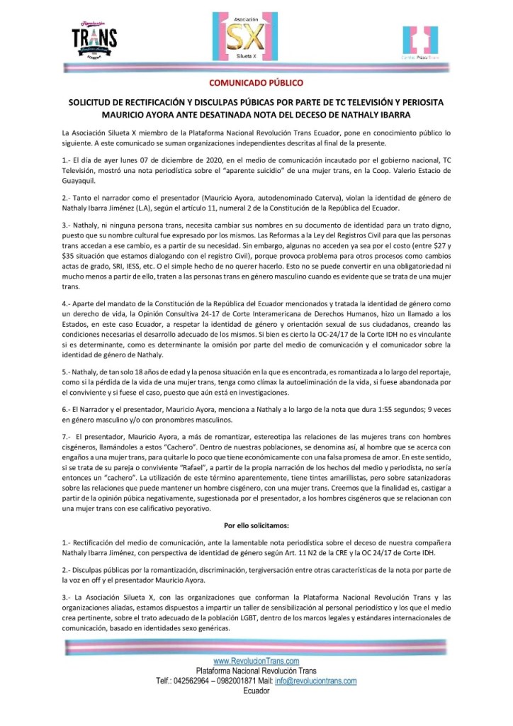 La Asociación Silueta X miembro de la Plataforma Nacional Revolución Trans Ecuador, pone en conocimiento público lo siguiente. A este comunicado se suman organizaciones independientes descritas al final de la presente.