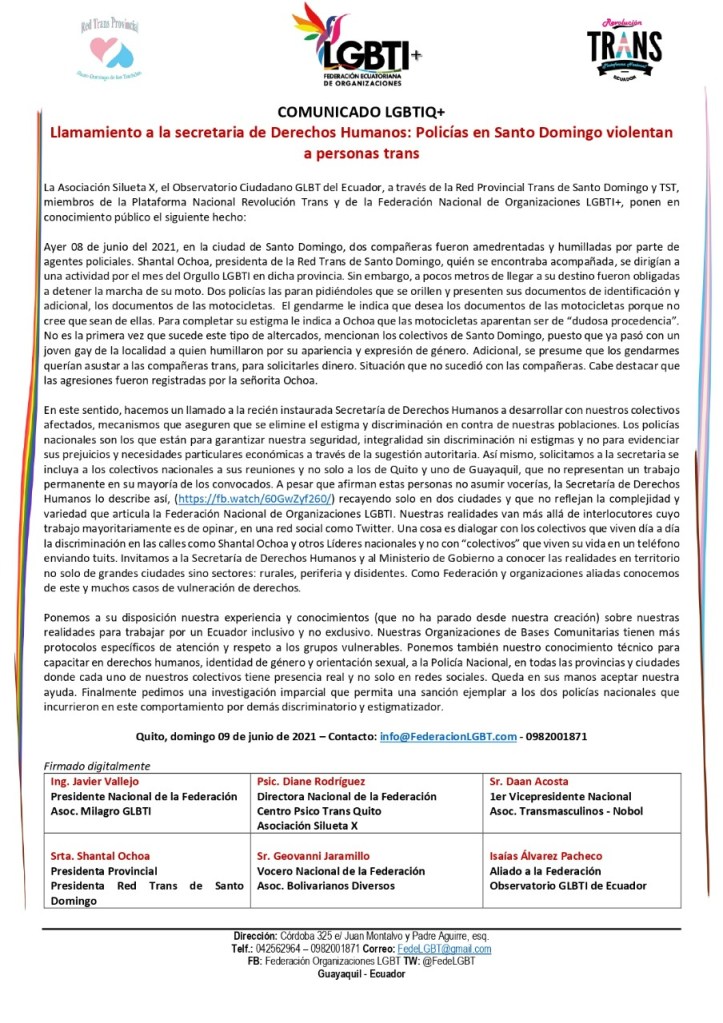 La Asociación Silueta X, el Observatorio Ciudadano GLBT del Ecuador, a través de la Red Provincial Trans de Santo Domingo y TST, miembros de la Plataforma Nacional Revolución Trans y de la Federación Nacional de Organizaciones LGBTI+, ponen en conocimiento público el siguiente hecho: