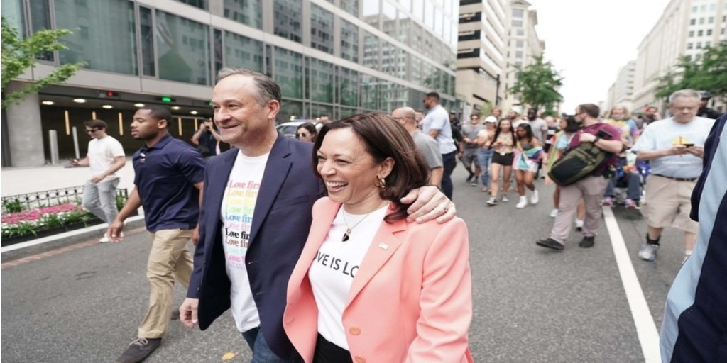 Con una camiseta que decía «Love is Love» (amor es amor) y acompañada por su marido, Doug Emhoff, acompañaron a los manifestantes gran parte del recorrido, siendo vitoreados por muchos de los asistentes al Orgullo.