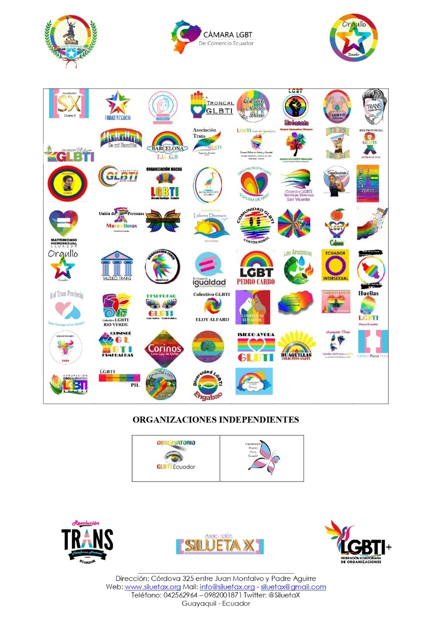 La Cámara LGBT de Comercio Ecuador y la Asociación Silueta X miembros de la Federación Ecuatoriana de Organizaciones LGBT, la Plataforma Nacional Revolución Trans, así como también colectivos miembros y aliados nuestro quienes participan en el Orgullo Guayaquil (www.OrgulloGuayaquil.com) y el Orgullo Ecuador (www.OrgulloEcuador.com) ponemos en conocimiento público lo siguiente: