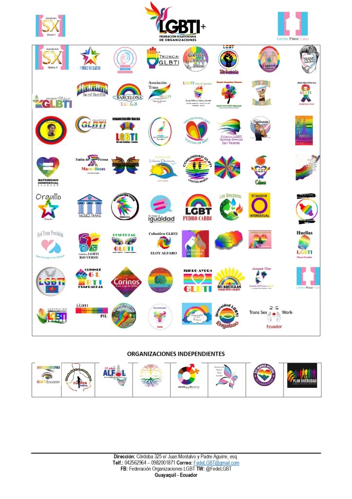 | Psic. Diane Rodríguez Directora Nacional de la Federación Centro Psico Trans Quito Asociación Silueta X | Lcdo. Javier Vallejo Presidente Nacional de la Federación Asoc. Milagro GLBTI | Sr. Daan Acosta 1er vicepresidente Nacional Asoc. Transmasculinos – Nobol |