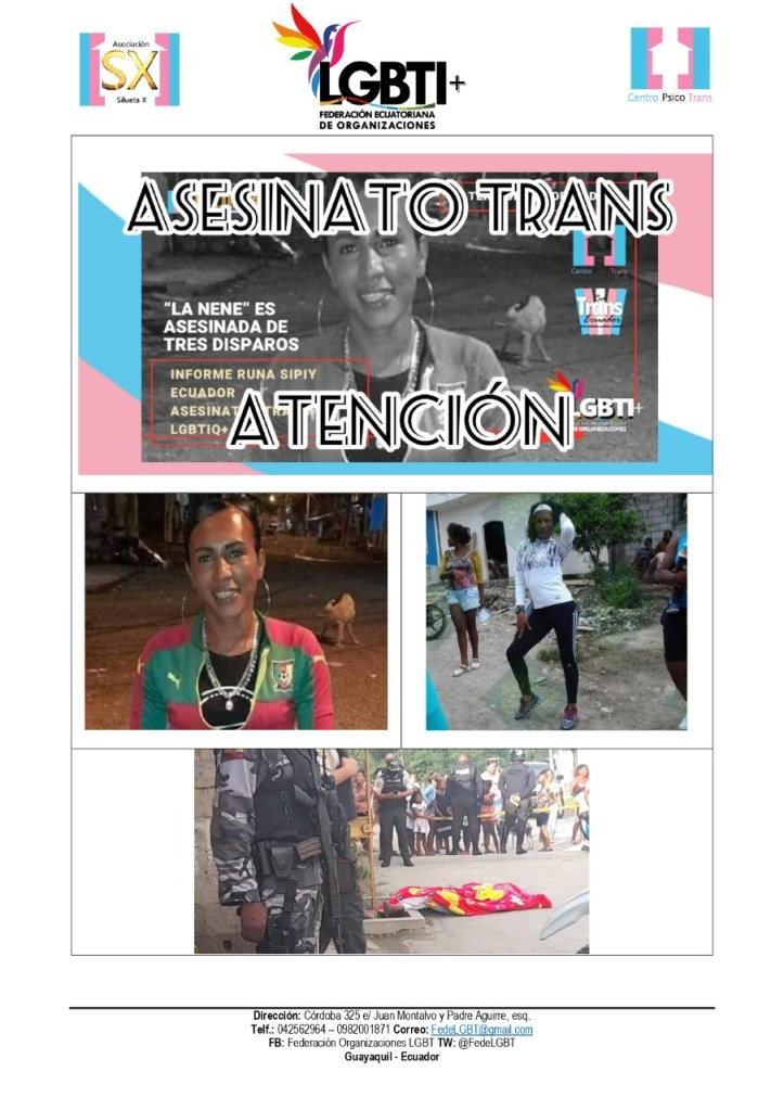 Por todo lo descrito hacemos un llamado a la fiscal general del Estado, Diana Salazar, al comandante de la Policía, Carlos Cabrera, al subsecretario de Diversidades Alexander Guano, al defensor del Pueblo de Ecuador (e), Cesar Córdoba Valverde, a realizar las coordinaciones necesarias para dar con el o los culpables, de este hecho que enluta nuevamente a nuestra comunidad.