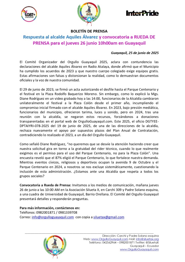El Comité Organizador del Orgullo Guayaquil 2025, aclara con contundencia las declaraciones del alcalde Aquiles Álvarez en Radio Atalaya, donde afirmó que el Municipio ha cumplido los acuerdos de 2023 y que nuestro cuerpo colegiado exige equipos gratis. Estas afirmaciones son falsas y distorsionan la realidad, como lo demuestran documentos oficiales y la voz de nuestra comunidad.